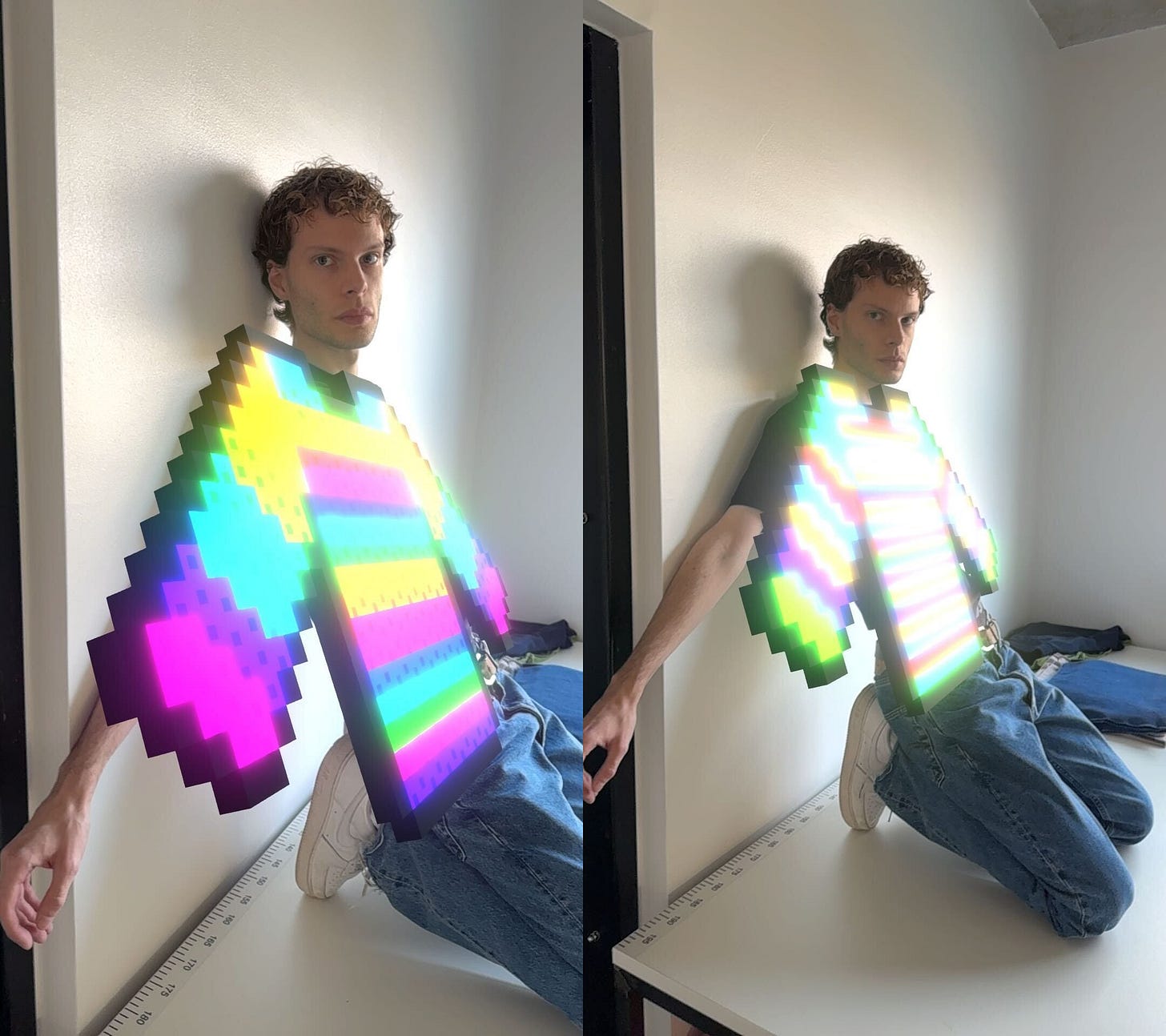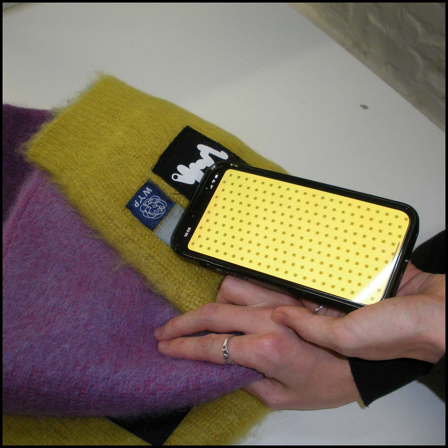 The digital blueprints created by the Generator are boxy virtual sweaters with an iconic early internet pixel aesthetic. They’re stored on the blockchain and belong to you when you get ODDS. I must admit, the Hyper Pipe blueprint looked so damn good it made me want one even more. The Tribute Touch label on your sweater instantly connects you to Tribute App, where you’ll find your digital assets. You can wear your blueprint as a digital skin in virtual spaces or in the real world through augmented reality: ideal when global warming hits and you rather wear pixels than cozy knitwear. When you’re wearing the physical sweater, Tribute App lets you change its appearance like a chameleon with mood-swings. For additional personalization you can add any link to your sweater, like your favorite song, to share with others when they scan your label.